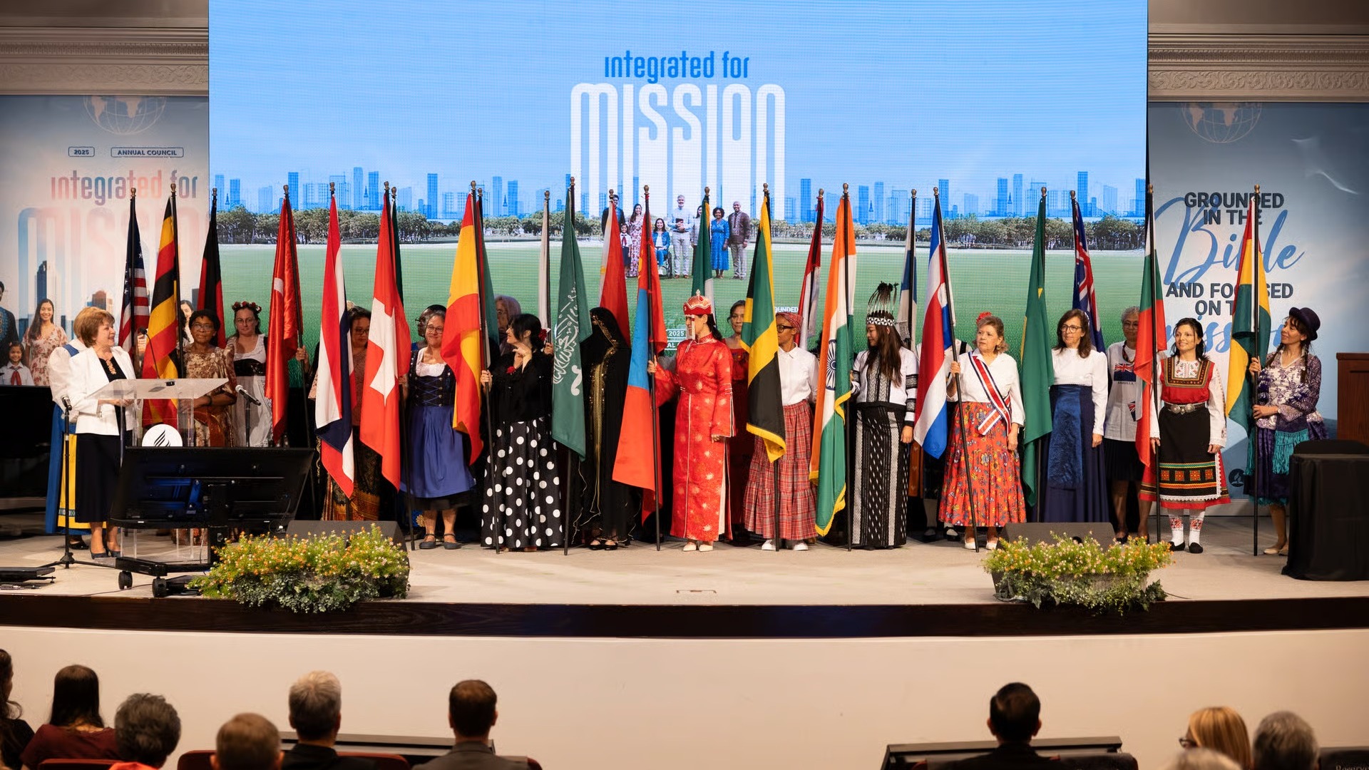 Il momento si è aperto con una sfilata delle nazioni, formata da donne in abiti tradizionali che portavano le bandiere dei vari Paesi nell’auditorium della sede centrale della denominazione, negli Stati Uniti.