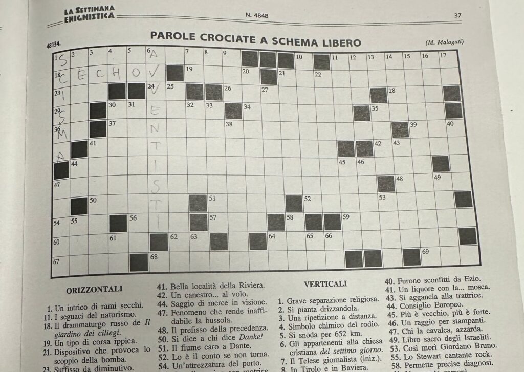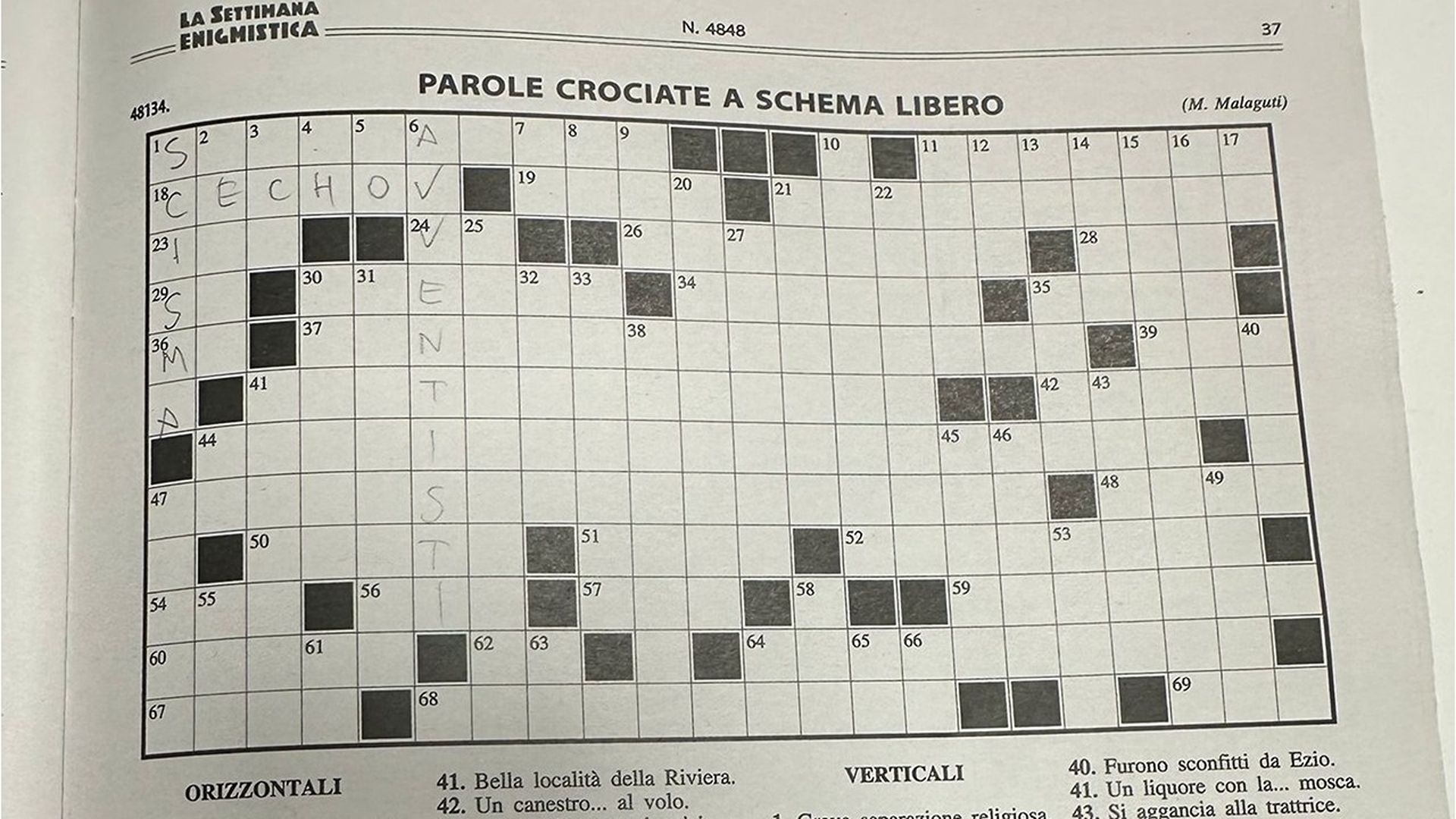 Scorrendo le pagine del numero 4848 de “La Settimana Enigmistica”, a pagina 37, Bruno Rimoldi, della chiesa avventista di Firenze, si è imbattuto nel grande quadro a tutta pagina delle parole crociate a schema libero e ha fatto questa piacevole scoperta. La rivista più famosa del genere mette alla prova i suoi fedeli lettori con rebus e passatempi che sviscerano tutto lo scibile. L’autore del cruciverba in questione è Massimo Malaguti, noto enigmista, che all’incrocio tra il primo orizzontale e il sei verticale ha inserito il quesito relativo alla nostra denominazione.
