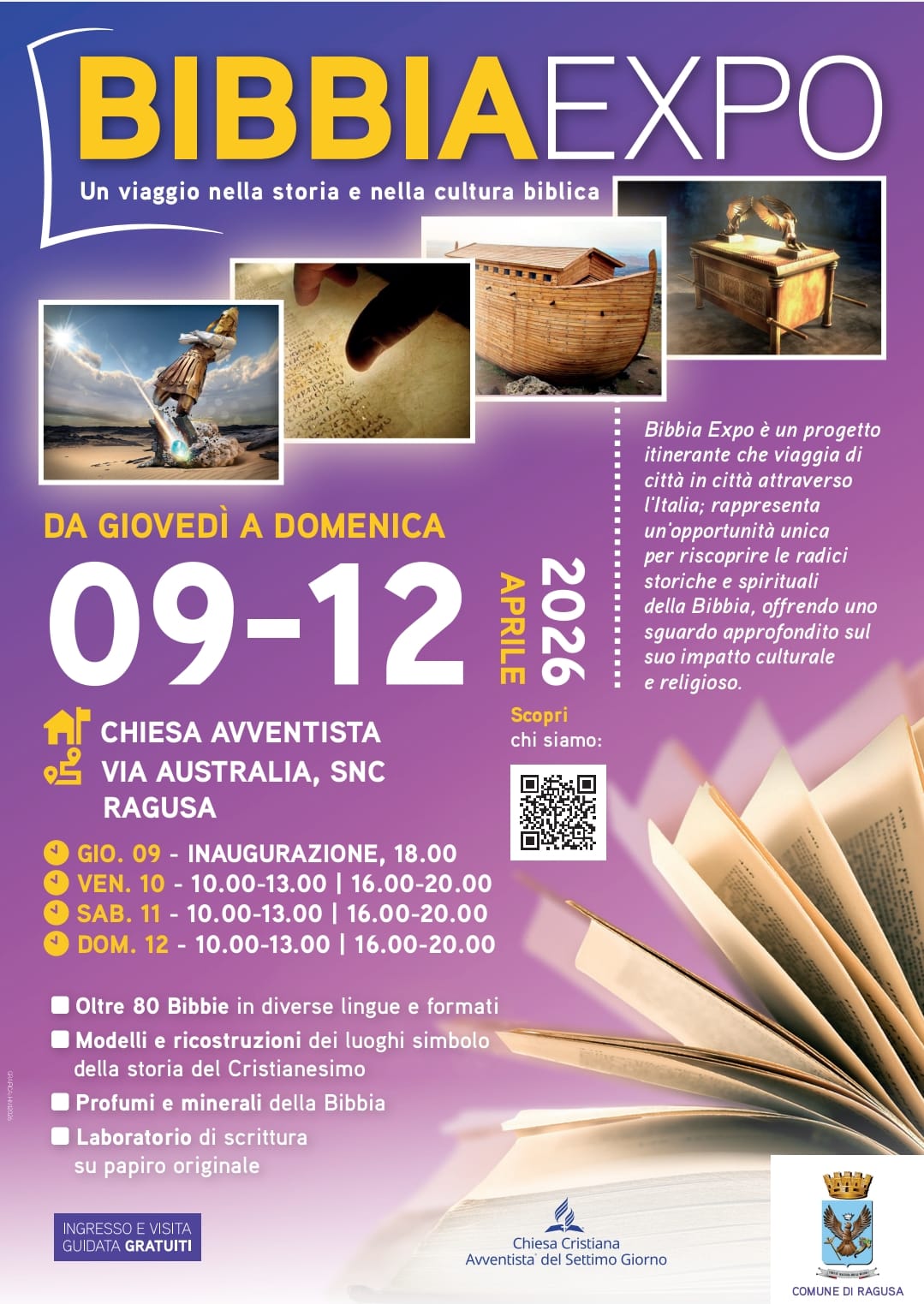Bibbia Expo sarà visitabile a Ragusa gratuitamente ogni giorno, dal 9 al 12 aprile, dalle ore 10 alle 13 e dalle 16 alle 20. La locandina è disponibile qui.