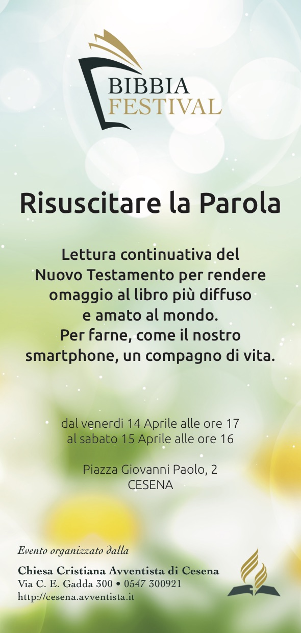 La sedicesima edizione della Lettura non stop del Nuovo Testamento, iniziativa organizzata dalla chiesa cristiana avventista di Cesena, fa parte del programma Bibbia Festival 2017 che prenderà il via nei prossimi giorni.