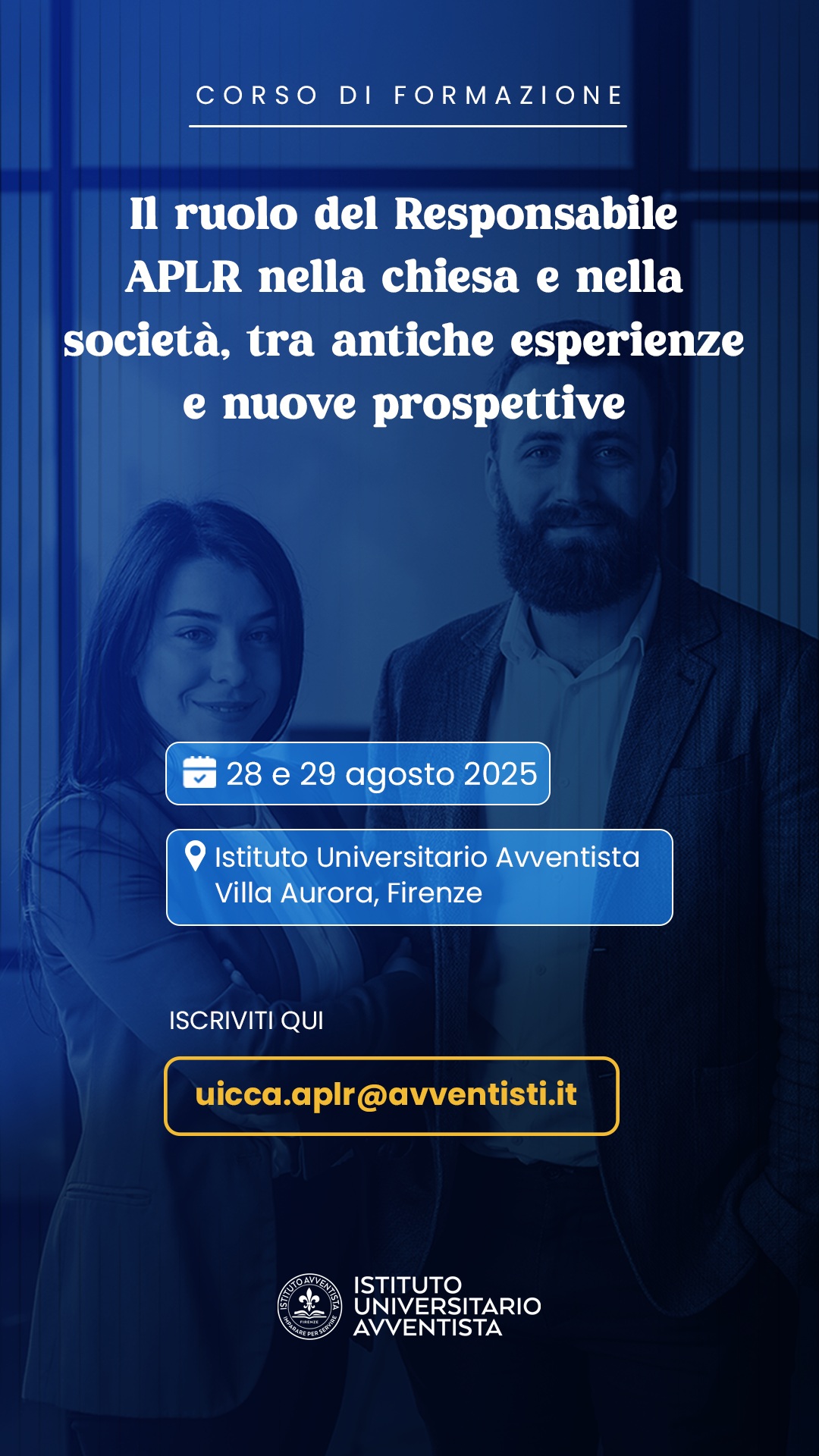 Notizie Avventiste – Il 28 e 29 agosto, presso l’Istituto Universitario Avventista “Villa Aurora” di Firenze, avrà luogo il Corso di formazione per i responsabili del Dipartimento Affari Pubblici e Libertà religiosa (APLR) delle chiese locali. “Il ruolo del responsabile APLR nella chiesa e nella società, tra antiche esperienze e nuove prospettive” sarà il tema dell’incontro.