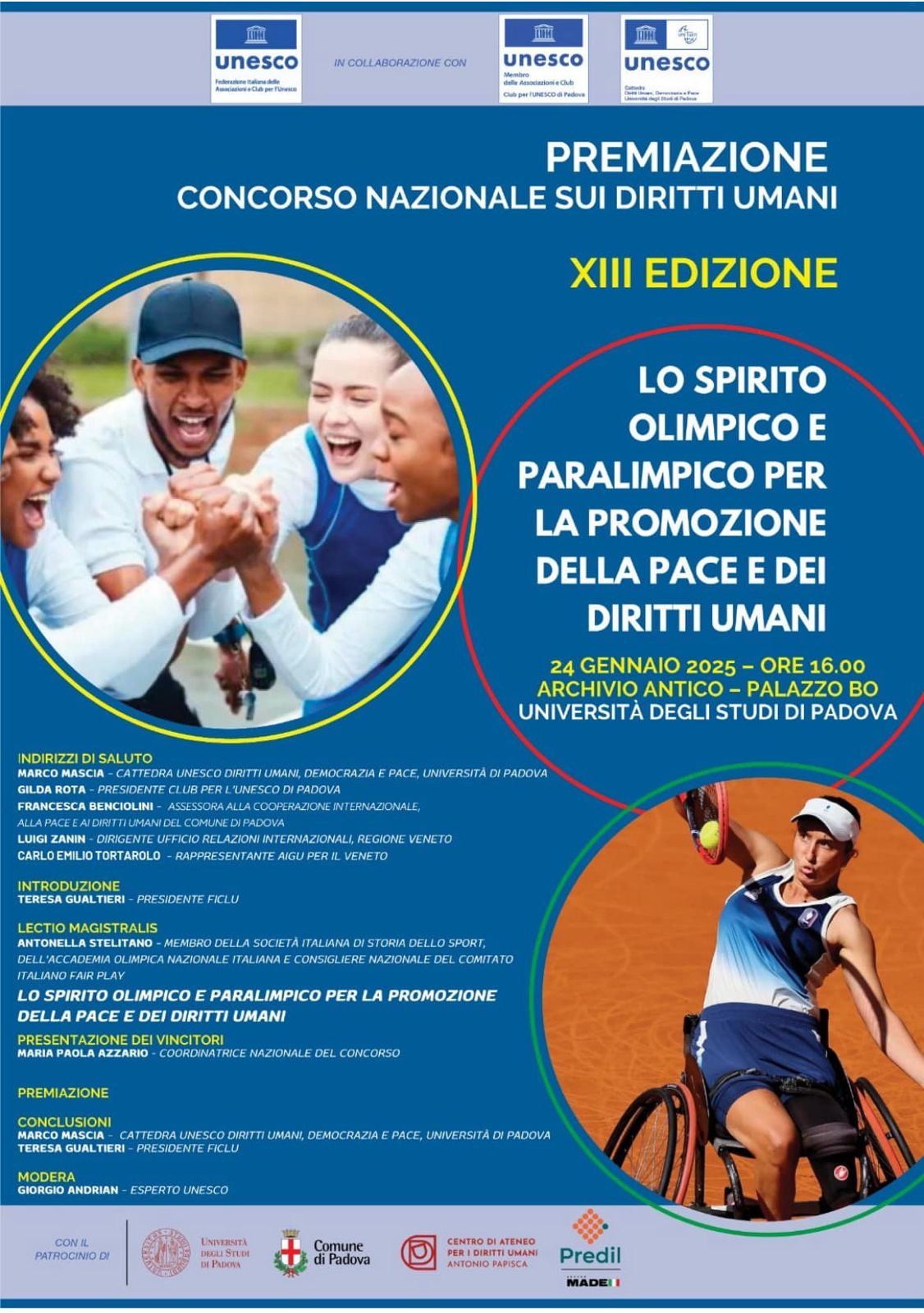 Il tema proposto dall’UNESCO per la Giornata Internazionale dell’Educazione 2025 è quanto mai attuale: riguarda il progresso tecnologico in relazione all’educazione. Come è anche importante il concetto “Lo spirito olimpico e paralimpico per la promozione della Pace e dei Diritti Umani”, tema del Concorso Nazionale FICLU (Federazione Italiana Club per l’UNESCO) “Agire i Diritti Umani”, di cui nell’Università Padova si tiene la premiazione.