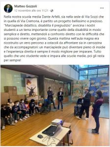 “Nella nostra scuola media Dante Arfelli, sia nella sede di via Scozzi che in quella di via Cremona, è partito un progetto bellissimo e prezioso. “Marciapiede Didattico disabilità il pregiudizio” avvicina i nostri studenti a un tema importante come quello della disabilità in modo semplice, diretto, mettendoli a confronto diretto con le difficoltà che si possono vivere ogni giorno. Questa mattina nell’aula magna era ricostruito un vero percorso a ostacoli da affrontare sia in carrozzina che da accompagnatori, un marciapiede può diventare pieno di insidie. L’esperienza diretta è sempre il modo migliore per imparare. Tutto quello che uno studente vede e impara alle scuole medie, poi gli resta per sempre”.