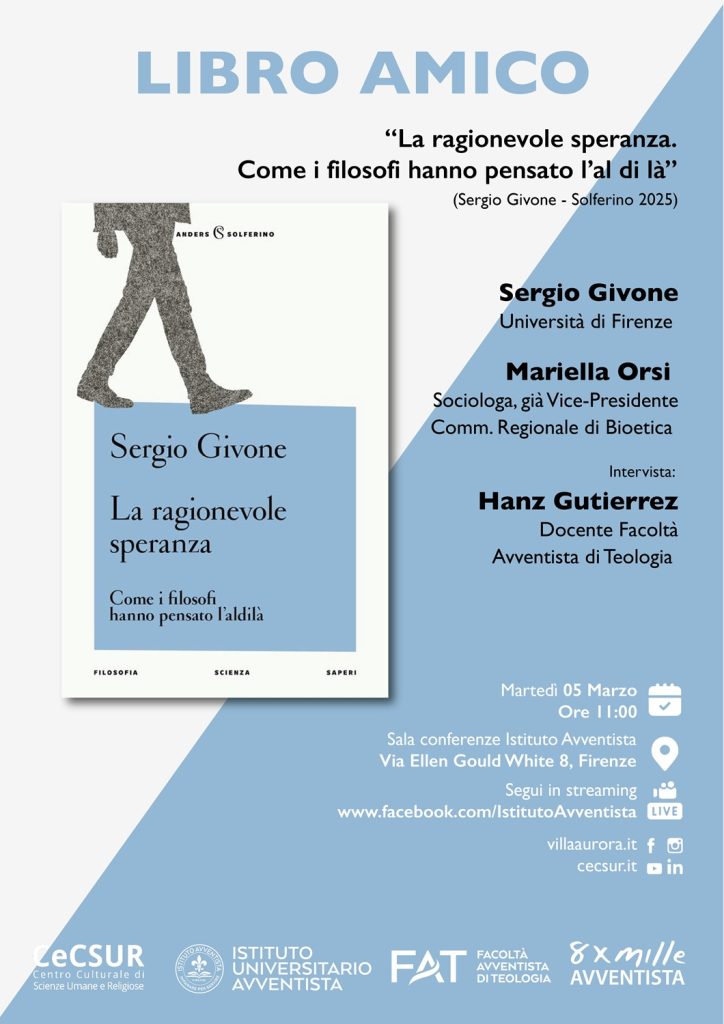Notizie Avventiste – Il Centro culturale di scienze umane e religiose (CeCSUR), l’Istituto “Villa Aurora” e la Facoltà avventista di teologia (FAT) di Firenze invitano a un nuovo incontro della serie Libro Amico.