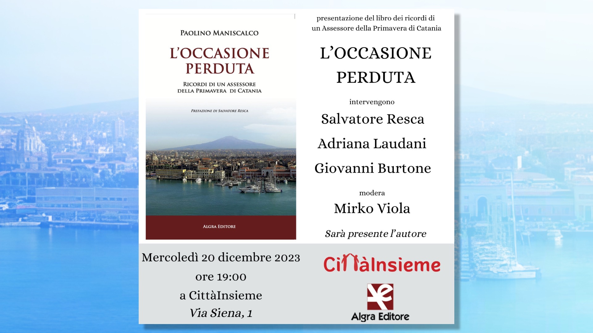 Ricordi di un assessore della primavera di Catania: intervista al dottor Paolino Maniscalco e presentazione del suo libro/diario.