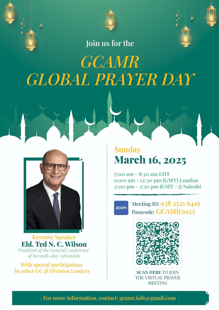 Domenica 16 marzo, sarà trasmesso un programma in diretta streaming, dalle 12.00 alle 13.30 ora italiana, che includerà una Giornata di preghiera globale e virtuale del Ramadan, guidata dal past. Ted N. C. Wilson, presidente della Chiesa avventista mondiale. Per maggiori informazioni scrivere all’email: gcamr.info@gmail.org
