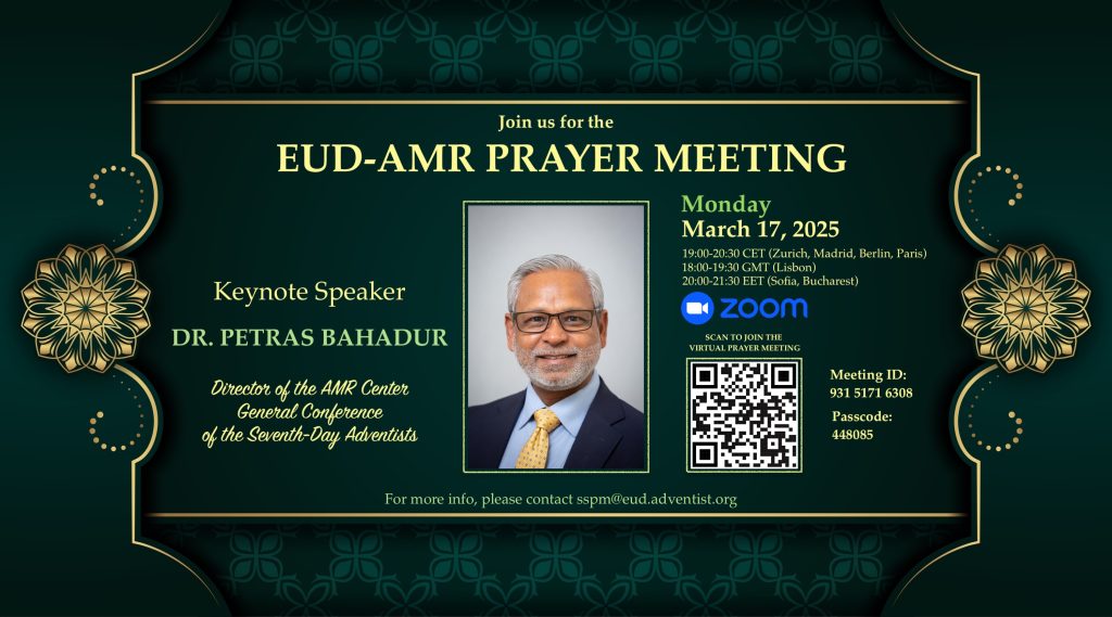 La sera di lunedì 17 marzo, dalle 19.00 alle 20.30 ora italiana, è la Regione intereuropea della Chiesa, insieme al Centro globale, a proporre un incontro di preghiera online condotto da Petras Bahadur. Per maggiori informazioni scrivere all’email: sspm@eud.adventist.org