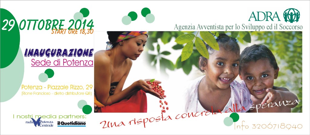 Giuseppe Dapoto – Mercoledì 29 ottobre, alle ore 18.30, si terrà l’inaugurazione della sede di Adra Italia (Agenzia Avventista per lo Sviluppo e il Soccorso) di Potenza, in Piazzale Rizzo 29 (nel rione Francioso). Alla manifestazione interverrà Valentina Marciano, direttore di Adra Italia, che, insieme al responsabile locale, presenterà l’Associazione umanitaria avventista e i programmi d’intervento previsti per il 2015.