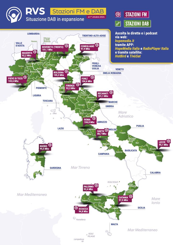 Rvs è ascoltabile dalla “classica” radiolina in FM solo nelle località segnate, ma i suoi programmi sono fruibili ovunque in Italia attraverso internet, satellite, Dab+ e App.