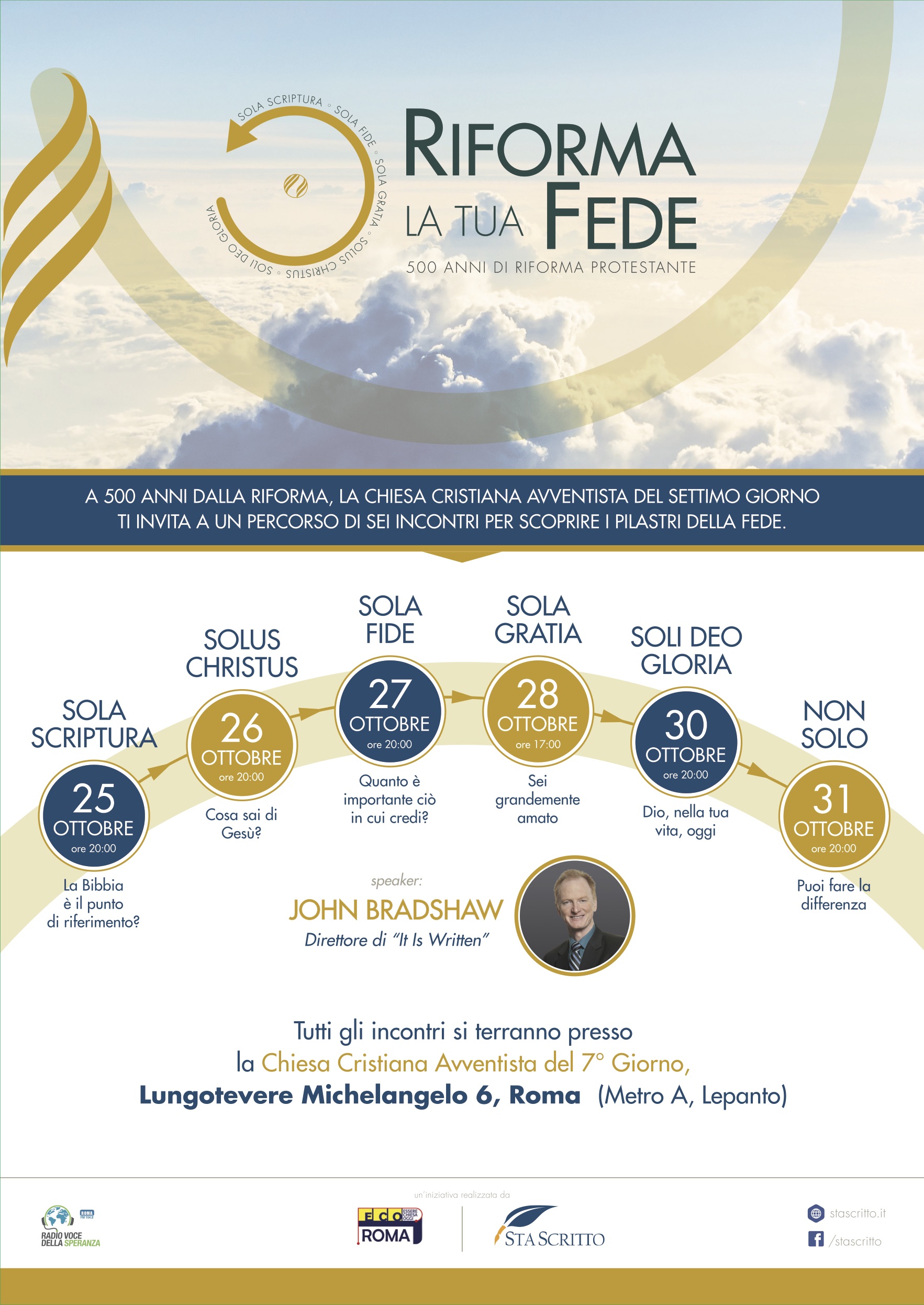 Per ricordare quanto sia stata importante la Scrittura per Lutero e quanto lo sia anche per noi oggi, la chiesa cristiana avventista della capitale organizza, dal 25 al 31 ottobre, una serie di incontri dal titolo generale “Riforma la tua fede. 500 anni di Riforma protestante”, per scoprire i pilastri della fede.