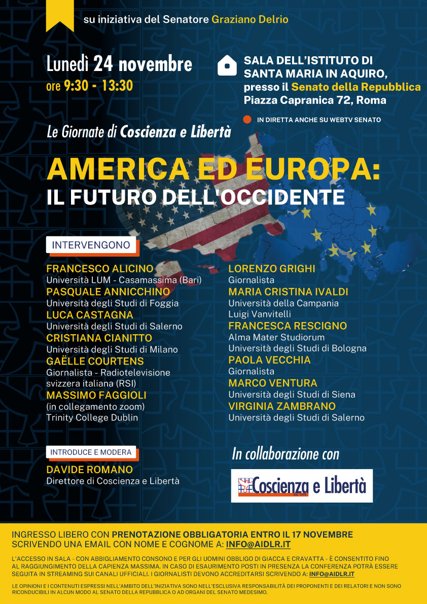 La rivista Coscienza e Libertà, organo d’informazione dell’Associazione internazionale per la difesa della libertà religiosa (AIDLR), è lieta di invitarvi al consueto appuntamento con “Le giornate di Coscienza e Libertà”, dal titolo: America ed Europa: il futuro dell’Occidente. I relatori parleranno, quindi, di America, Occidente e diritti fondamentali, ma anche di cultura, politica, religione e del loro rapporto.