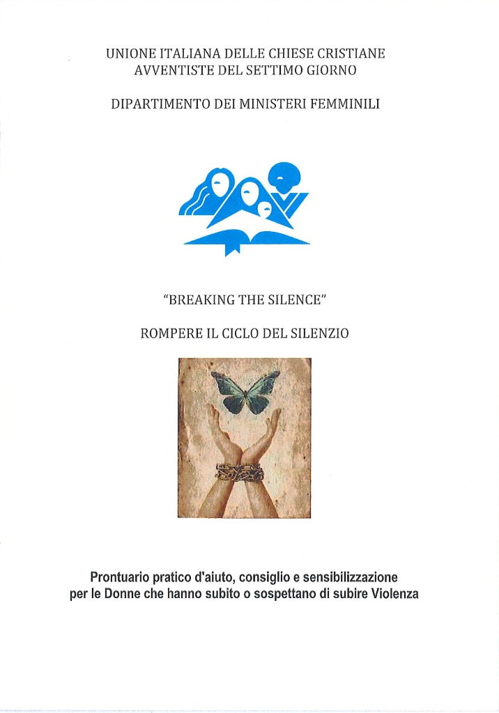 Il prontuario “Rompere il ciclo del silenzio”, prodotto dal dipartimento dei Ministeri Femminili dell’UICCA (Unione Italiana delle Chiese Cristiane Avventiste del Settimo Giorno), vuole essere uno strumento che informa e indica quali interventi e servizi sono pronti a entrare in azione nel contrastare i fenomeni di violenza. È un piccolo manuale pratico d’aiuto, consiglio e sensibilizzazione, facilmente consultabile. Prende in considerazione il linguaggio, la percezione e i modi della violenza, gli atti persecutori: mobbing, stalking, manipolazione affettiva, femminicidio. Le conseguenze sulla donna: di carattere fisico, relazionale e materiale, psicologico. Le conseguenze sui figli.