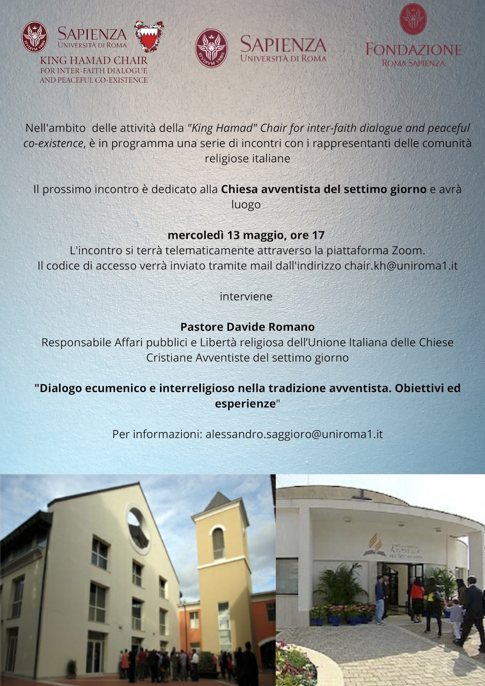 Nell’ambito delle attività della “King Hamad” Chair for interfaith dialogue and peaceful coexistence, in collaborazione con Fondazione Roma Sapienza, è in programma una serie di incontri con rappresentanti delle comunità religiose italiane.