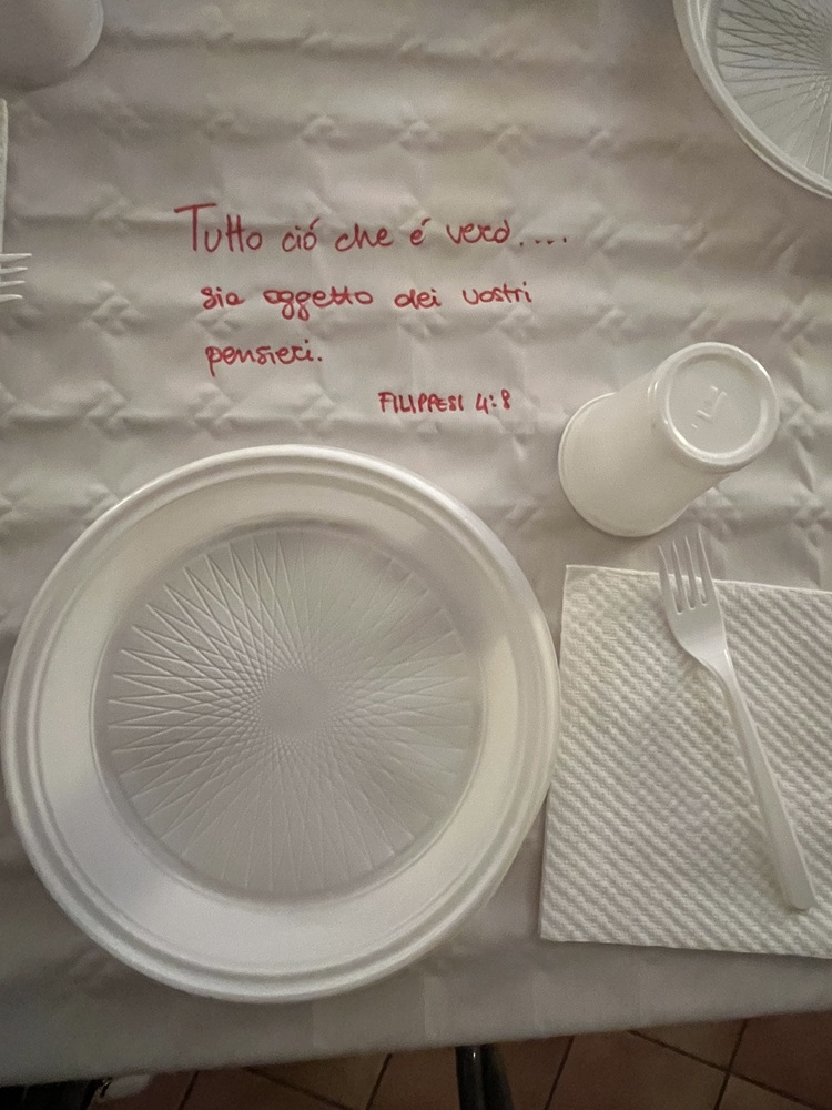 Dal 9 al 15 novembre, nella chiesa avventista di Sesto San Giovanni abbiamo vissuto la Settimana di preghiera. Il venerdì sera la comunità si è riunita per la serata conclusiva, in un momento speciale di inizio del sabato insieme, capace di unire familiarità, spiritualità e profonda riflessione. All’interno della sala di culto sono stati preparati dei tavoli per la cena spirituale disposti a raggiera, convergenti verso il pulpito. L’atmosfera era resa maggiormente accogliente anche grazie a luci calde disposte nella sala, che ricordavano l’intimità di una casa pronta ad accogliere la famiglia. Sulle tavole, le tovaglie di carta recavano scritti a mano alcuni versetti biblici, piccoli frammenti della Parola pronti a parlarci anche attraverso la loro semplicità.