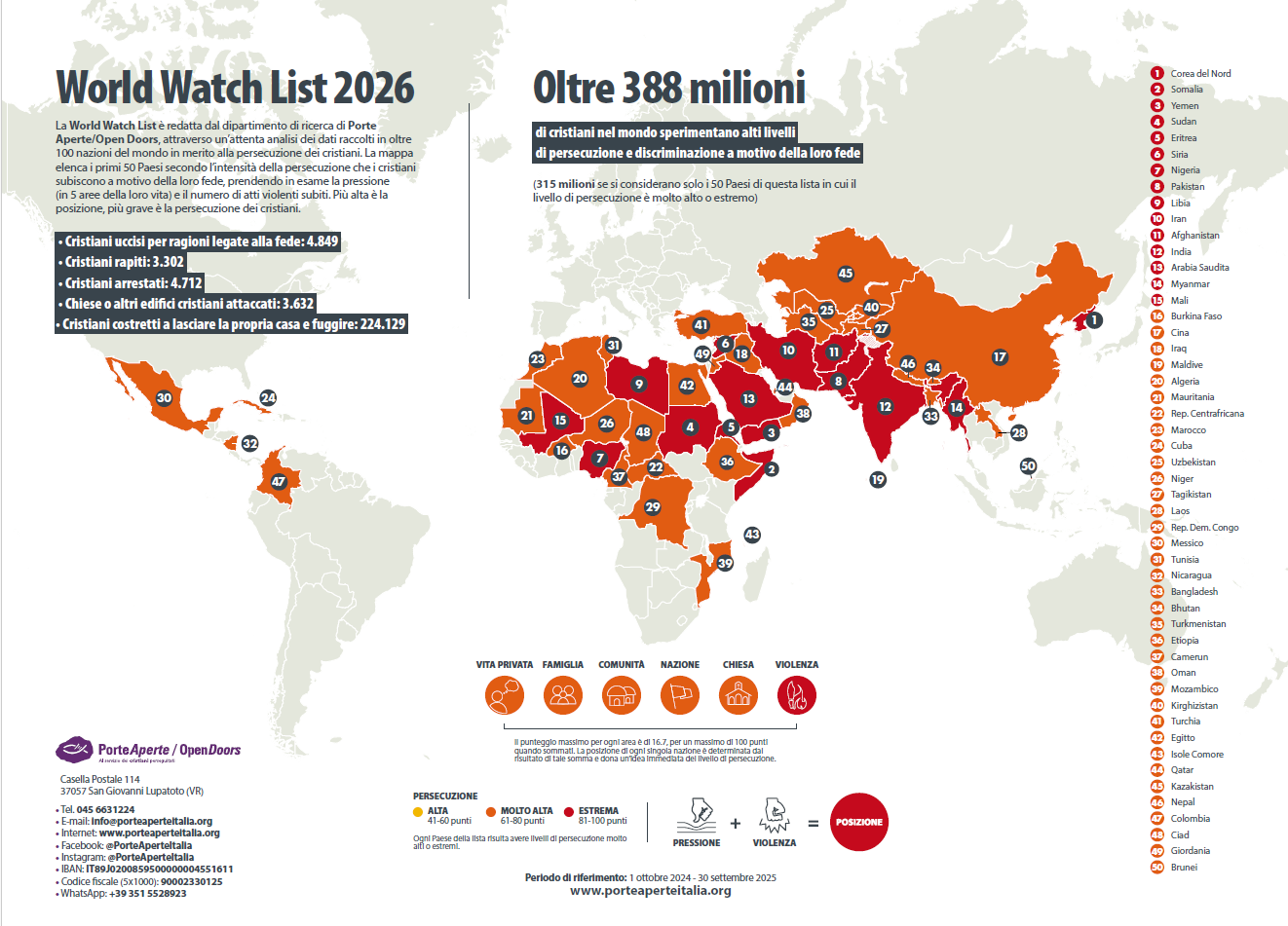 Porte Aperte è una fondazione che dal 1955 porta soccorso e aiuti concreti ai cristiani perseguitati in tutto il mondo. Ogni anno pubblica la World Watch List, relativa ai 50 Paesi dove i cristiani sono più perseguitati. La WWL 2026 prende in esame il periodo che va dal 1° ottobre 2024 al 30 settembre 2025
